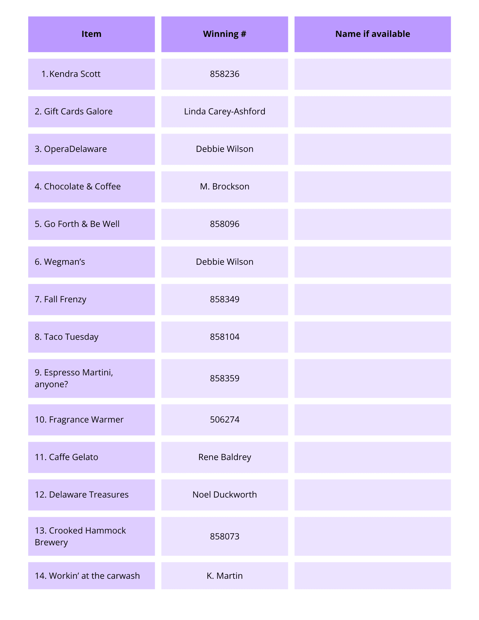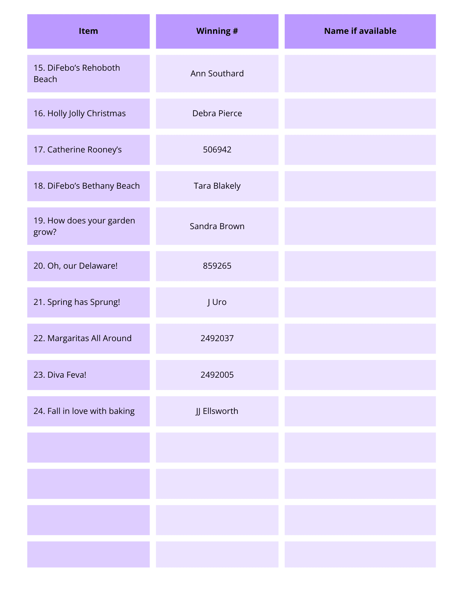 Congratulations to the winners! If your name or ticket number is on the list below, please reach out to Jen at juro@dcadv.org to arrange for pick up.