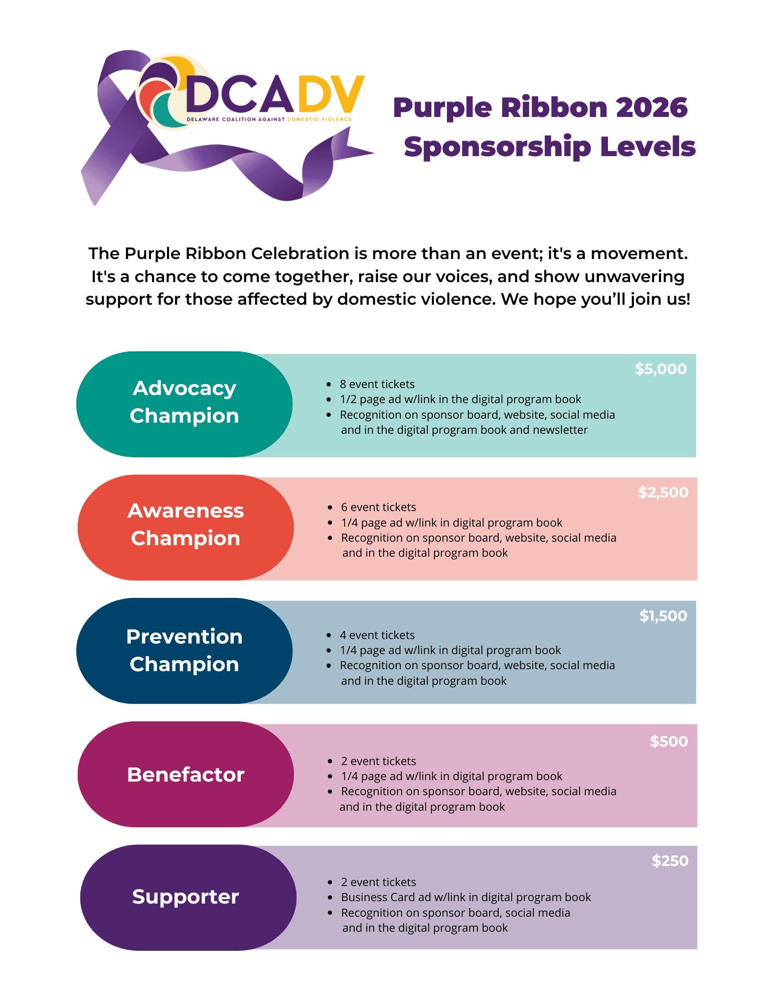 Sponsorships are available! Contact Jen at juro@dcadv.org for more information.